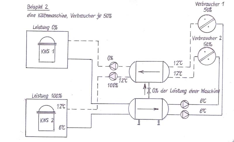 Die Volumenströme der Kaltwassersätze sind immer konstant, die der Verbraucher (Sekundärkreise) zwischen 5% und 100% variabel.